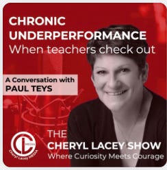 Chronic UnderperformanceWhen Teachers Check OutCheryl Lacey DGSJFeb 11, 2026∙ PaidShare Not every struggling teacher is a beginner finding their feet. Some are veterans who’ve stopped growing.There is a persistent problem of teacher underperformance - for some schools - across systems …Continue reading this post for free, courtesy of Cheryl Lacey DGSJ.Claim my free postOr purchase a paid subscription.PreviousNext